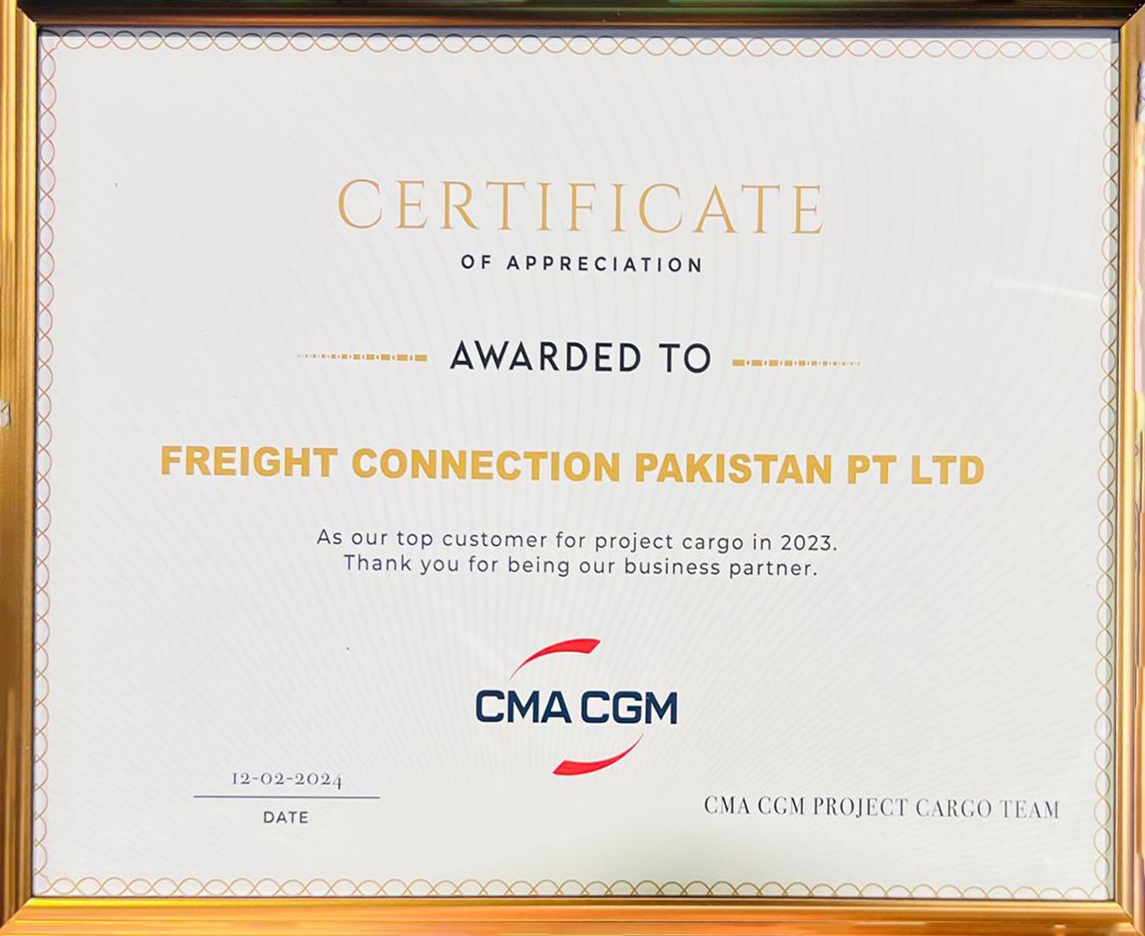 Freight Connection Group Pakistan Awarded the Top Customer Project Cargo 2023 by CMA CGM!