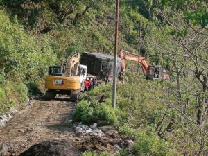 Once the cargo reached Kolkata, Nepalaya Logistics took the delivery on hook and then the pieces where loaded on special low bed trailers. Due to the dimension of the cargo, they had to request to open the toll gates of the road between Kolkata to the Nepal border. At the border, they offloaded the pieces on specially designed low bed trailers made for taking heavy weight (OOG) cargos through the difficult Himalayan roads. Due to road conditions and the nature of the cargo, at various places, Nepalaya Logistics had to pull the trailers from the front with an excavator and push the cargofrom behind with a second excavator. The roads condition were so poor and the width was less than the cargo width so wheel loaders and excavators where deployed simultaneously in order to construct the road and move the cargo simultaneously.