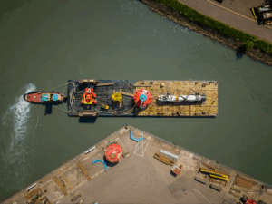 This time Tiel Logistics arranged a shipment for a (de)mobilization for offshore equipment. This equipment is part of a project in the North Sea for Arcadis Ost 1 Offshore Wind Farm where they are working on renewable & sustainable energy. This renewable/sustainable energy improves public health and creates local jobs and a lot more benefits. In this shipment Tiel Logistics arranged the floating cranes, pontoon freight and trucking with their own trailers, supply of mats and of course Tiel Logistics coordination. They would like to thank all the parties involved for the smooth operation!